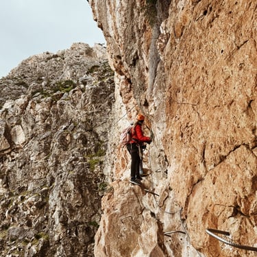 *Via ferrata - maršrutas uoloje su įrengtais metaliniais laiptais, kopėčiomis ir trosu, prie kurio prisisegama saugos įranga.